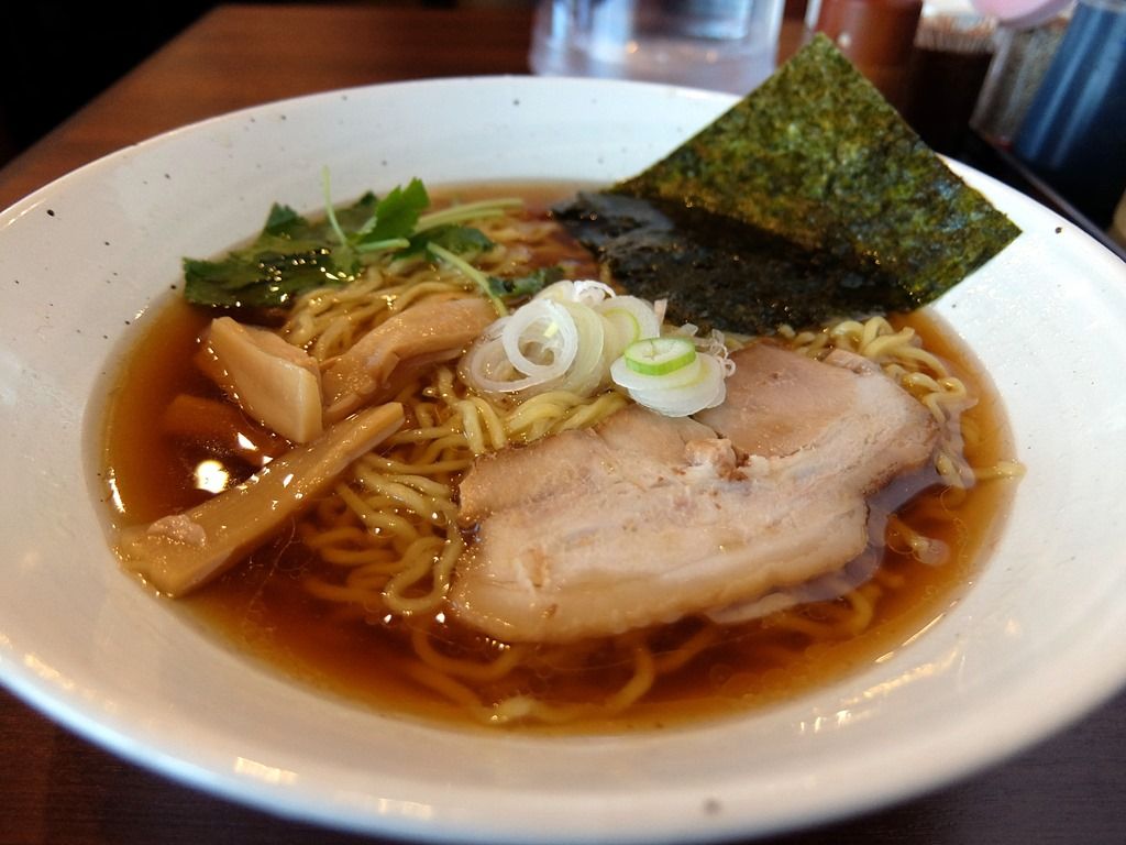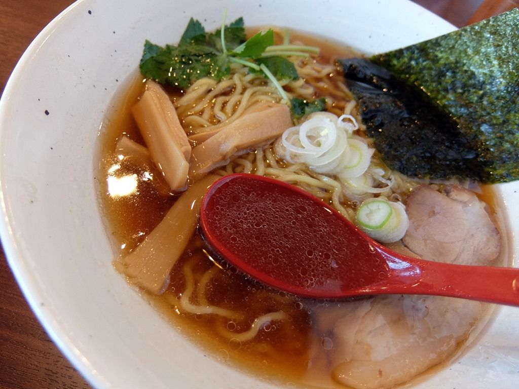スープはさらさらの清湯醤油味。メニューの説明書きによると、「アゴ(飛び魚)、いりこ、昆布等、数種類の魚介を組み合わせ動物系のスープと合わせたどこか懐かしい一杯」とか。チェーン店っぽい総花的なメニューラインナップであまり期待できませんでしたが、ぶっちゃけ美味しい!すっきりあっさりの淡麗スープで、焼あごの旨味がキリッと出ています。なんとなく出来合い感は拭えませんが、旨いものは旨いというw