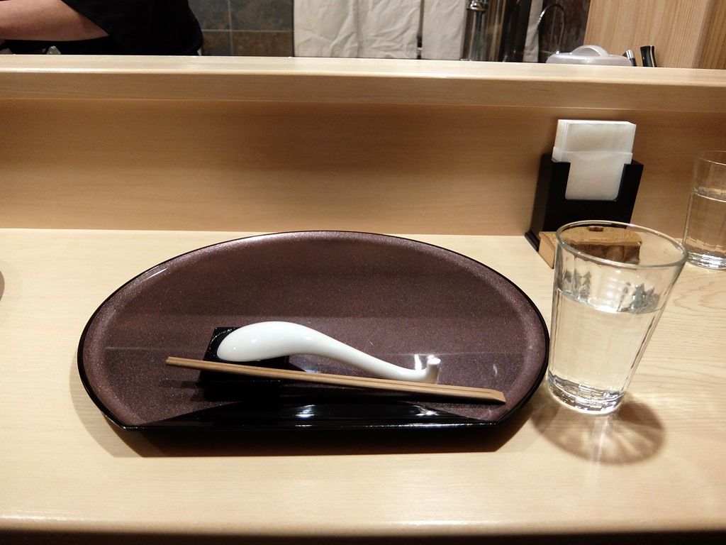 BGMはモダンジャズ。あらかじめお盆にセッティングされた箸は割り箸。卓上調味料は無し。