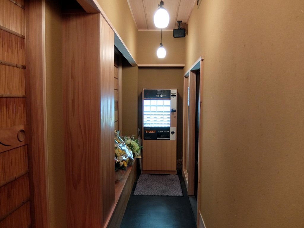 入店すると、通路があってその先に券売機。入口から客席まで通路を作るのは、日常と非日常の間を分ける緩衝地帯を設けるためで、高級料亭などで採用される手法。