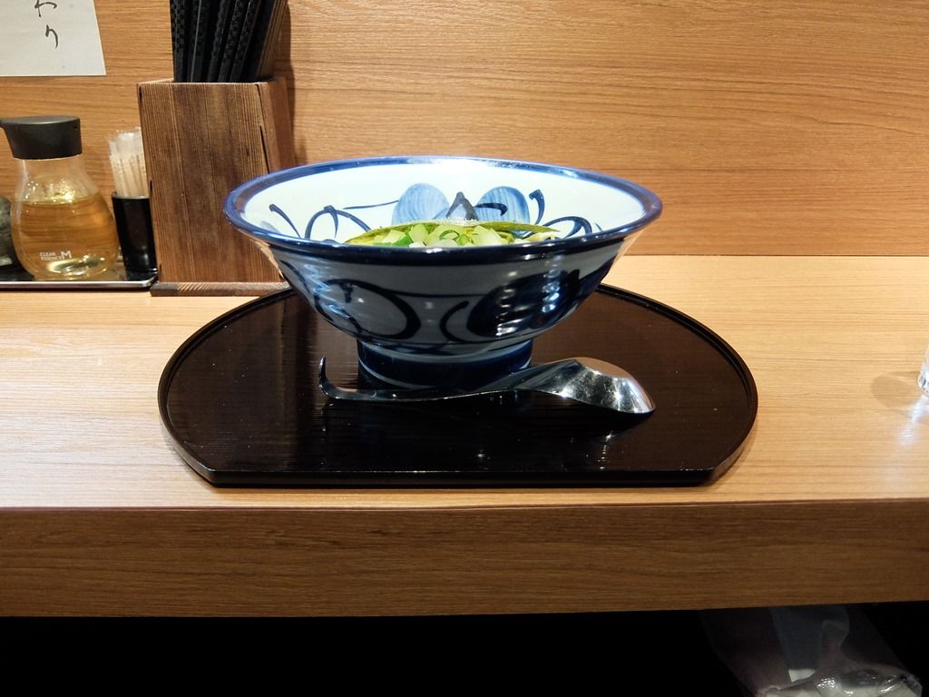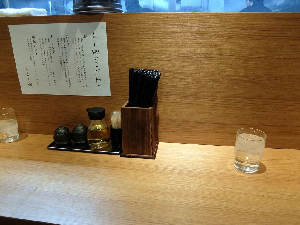 店内は、厨房を囲むL字型カウンター12席(10席・2席)。20:30頃到着で、先客6後客無し。スタッフは全員男性で、厨房2、ホール担当1。メインで調理を担当されてる方が吉田さん。接客は、元気過ぎずうるさ過ぎない、親切丁寧な対応で好感が持てます。
