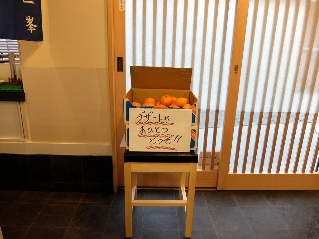テーブル席隣のスペースは、ガラス窓から中が見える製麺室。厨房には店主ご夫妻、二人三脚の息の合ったオペレーション。この日は、退店時にデザートとしてみかんが振る舞われてました。