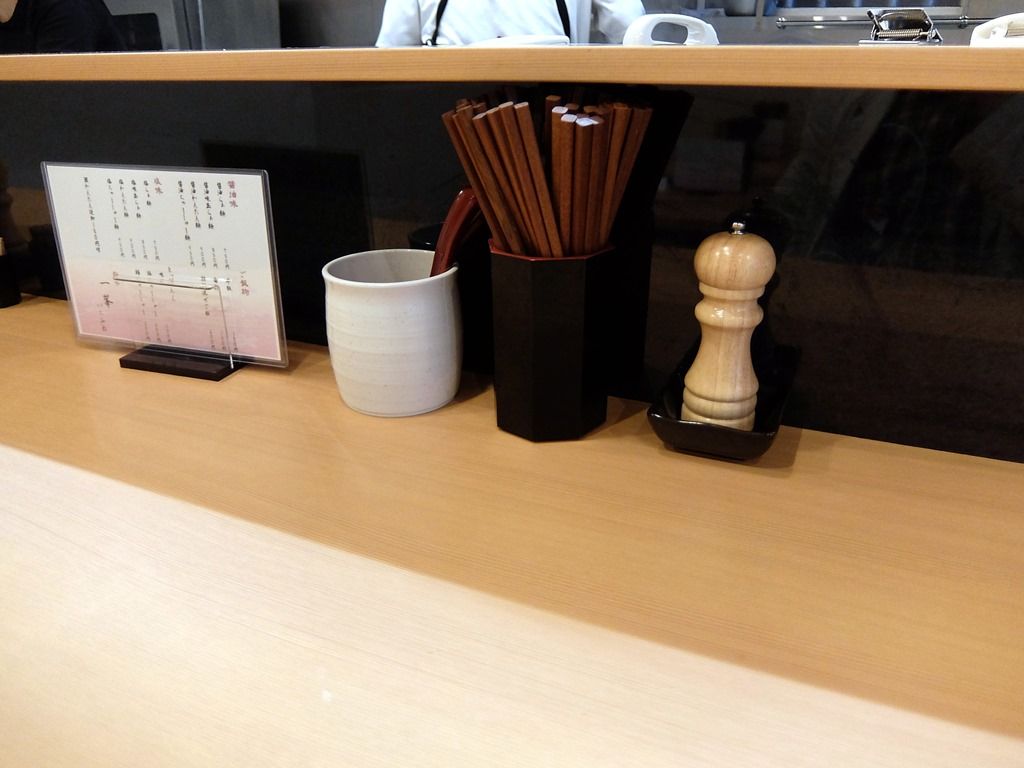 BGMはインストゥルメンタル。箸は洗い箸でエコ仕様。卓上調味料はミル入り胡椒。