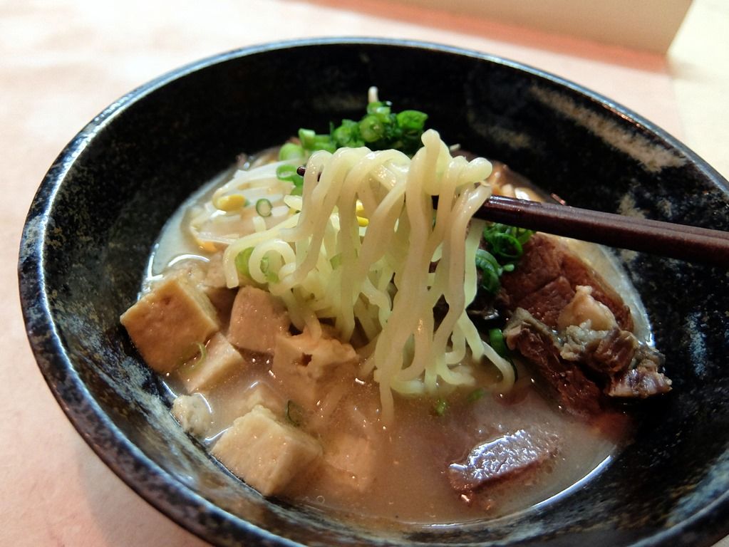 麺は、中細縮れタイプ。あまり特徴のないいたって普通の麺ですが、それだけにスープと具が引き立ってます。具では、ラム肉チャーシューが柔らかくて絶品の美味さ!肉の量も多めでお得感あります。