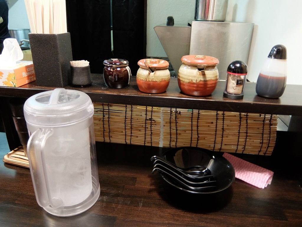 BGMはJ-POP、世界に一つだけの花とかw 箸は割り箸。卓上調味料・薬味は、紅生姜、おろしにんにく、辛子高菜、タレ?