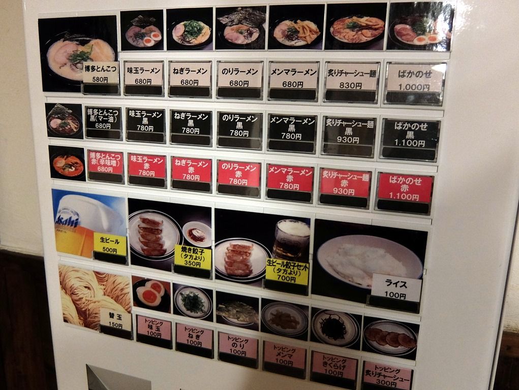 入店するとまず券売機で食券購入です。主なメニューは、博多とんこつ580円、博多とんこつ黒(マー油)680円、博多とんこつ赤(辛味噌)680円、替玉150円、焼き餃子350円、他。