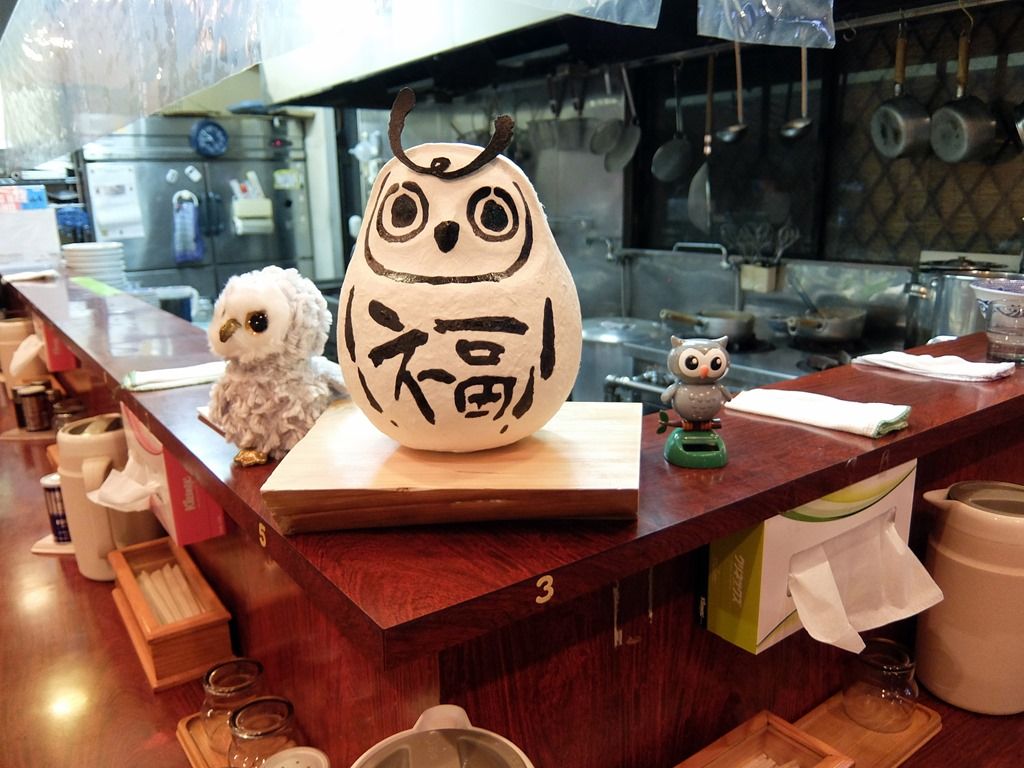 店内は、厨房を囲むL字型カウンター8席(3席・5席)、4人卓x2。ただしカウンターの短い辺の端1席は、開店祝い花が寄せて置いてあり未開放。カウンター角には、看板のイラストにもなっているだるま型ふくろうのマスコットが鎮座。