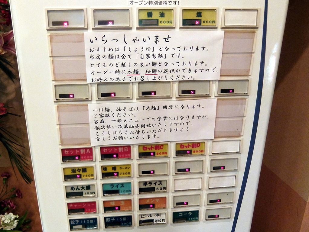 主なメニューは、醤油600円、塩600円、坦々麺750円、味噌ラーメン750円、他。醤油・塩はオープン特別価格。ただし、訪問時醤油以外の麺は売切れ表示。券売機の貼紙には、当面メニューを絞っての営業とのアナウンス。
