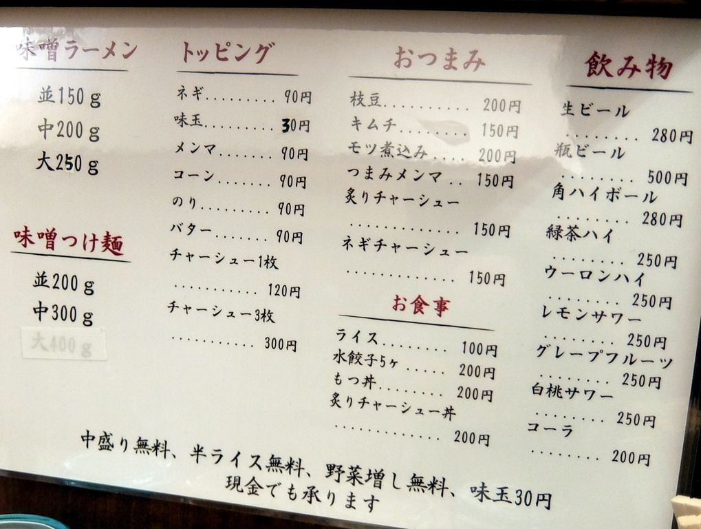 無料サービスが充実していて、中盛・半ライス・野菜増し無料。味玉は30円と出血プライス。オーダーは、「味噌ラーメン」を野菜増しで。