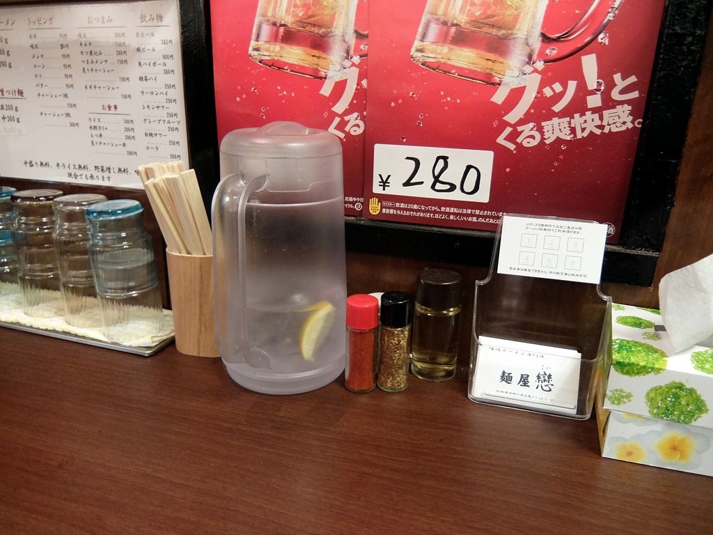 BGMはJ-POP、ONE LOVEとか懐かしい〜!箸は割り箸。卓上調味料は、一味唐辛子、胡椒、酢。