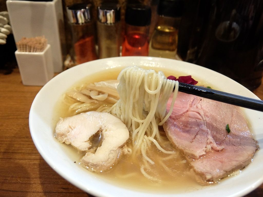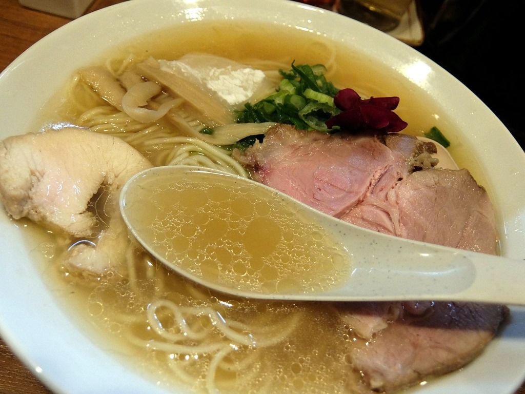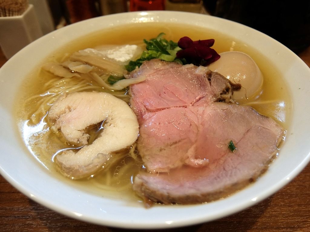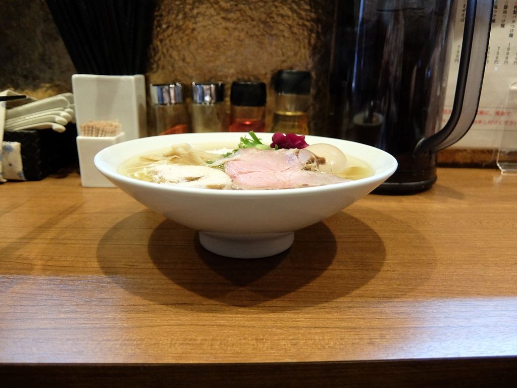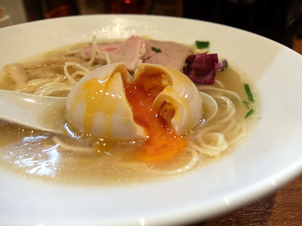 具では、和菓子に使われる求肥とエディブルフラワーが珍しいです。求肥は甘くなくて、餅の様な食感が楽しめます。味玉はとろっとろの半熟で、パクリといただけちゃいます。