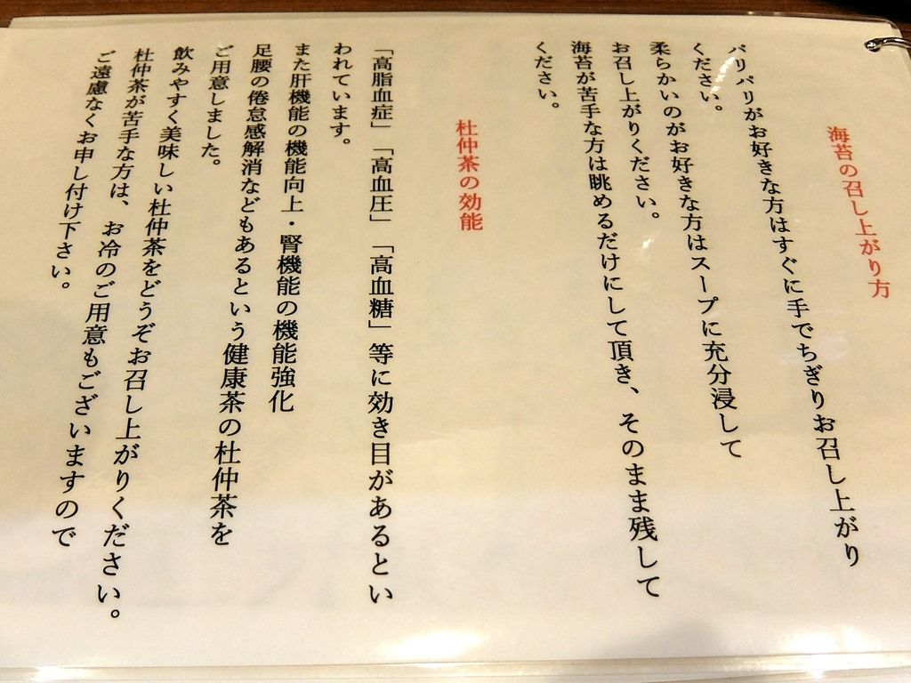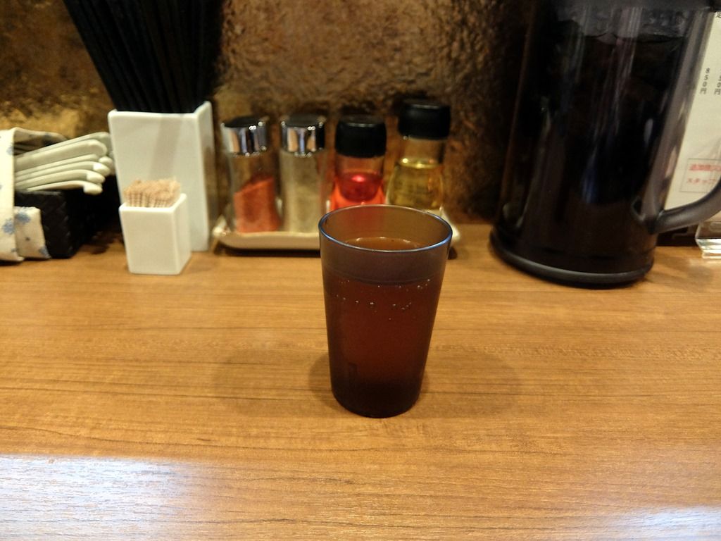 結局1時間10分待ちで着席。店内は、厨房を囲むL字型カウンター11席(9席・2席)。厨房には寡黙な店主さんと女将さん。接客担当の女性の3名体制。ウェルカムドリンク、というかお冷代わりのお茶は杜仲茶。