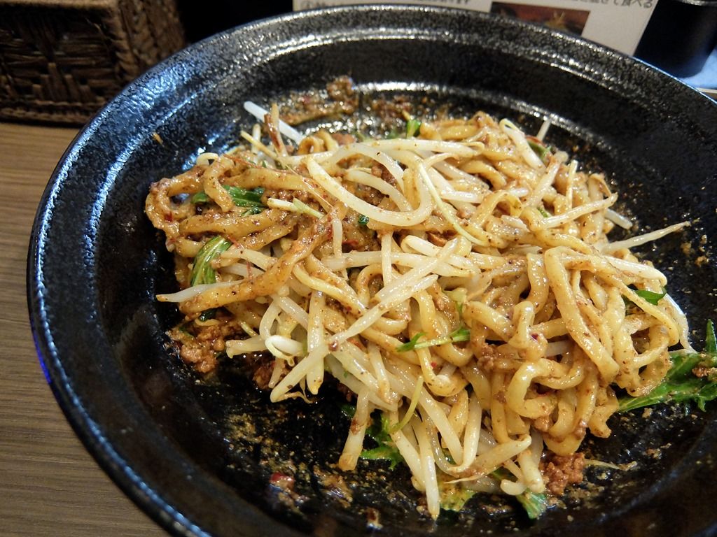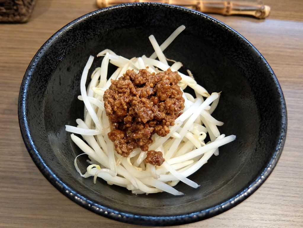 まずは肉味噌もやしが登場。突き出しで肉味噌もやしを出す汁なし担々麺の店と言えば、紅蠍 Red Scorpion@御成門が真っ先に思い浮かびます。そのインスパイアなのか、それとも何か関連があるのか!?