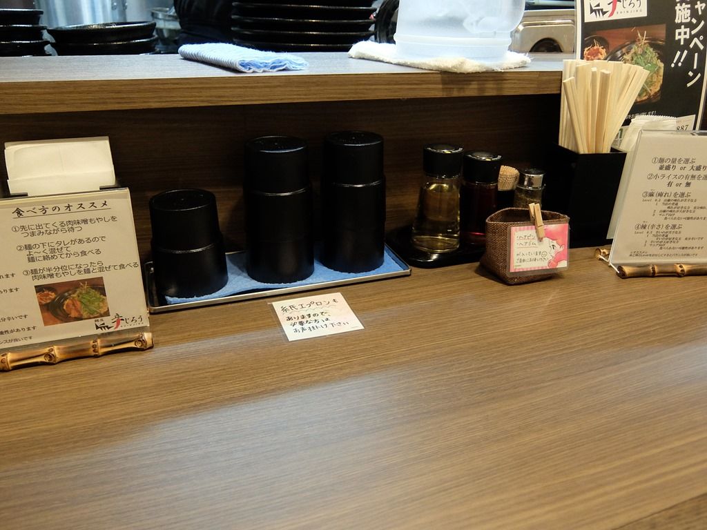 BGMはポップス。箸は割り箸。卓上調味料は、酢、ラー油、胡椒。