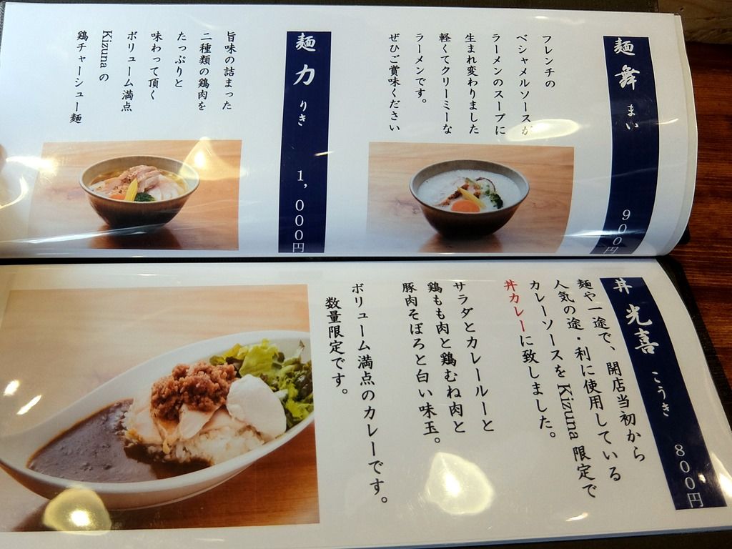 券売機は無く後会計制。メニューブック1ページ目はご挨拶。本店のスープは仔牛の骨を使用したフォン・ド・ヴォー、「Kizuna」のスープは鶏ガラや丸鶏・香味野菜等から摂ったフォンドヴォラーユを使用とか。そういえば、昨年末リニューアルオープンした「暴雷油」も「フォン・ド・ヴォライユ(Fond de volaille)」使用でした。