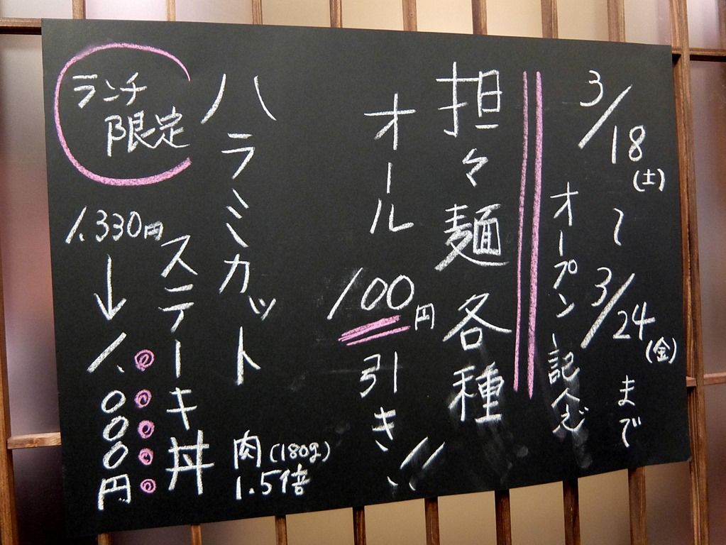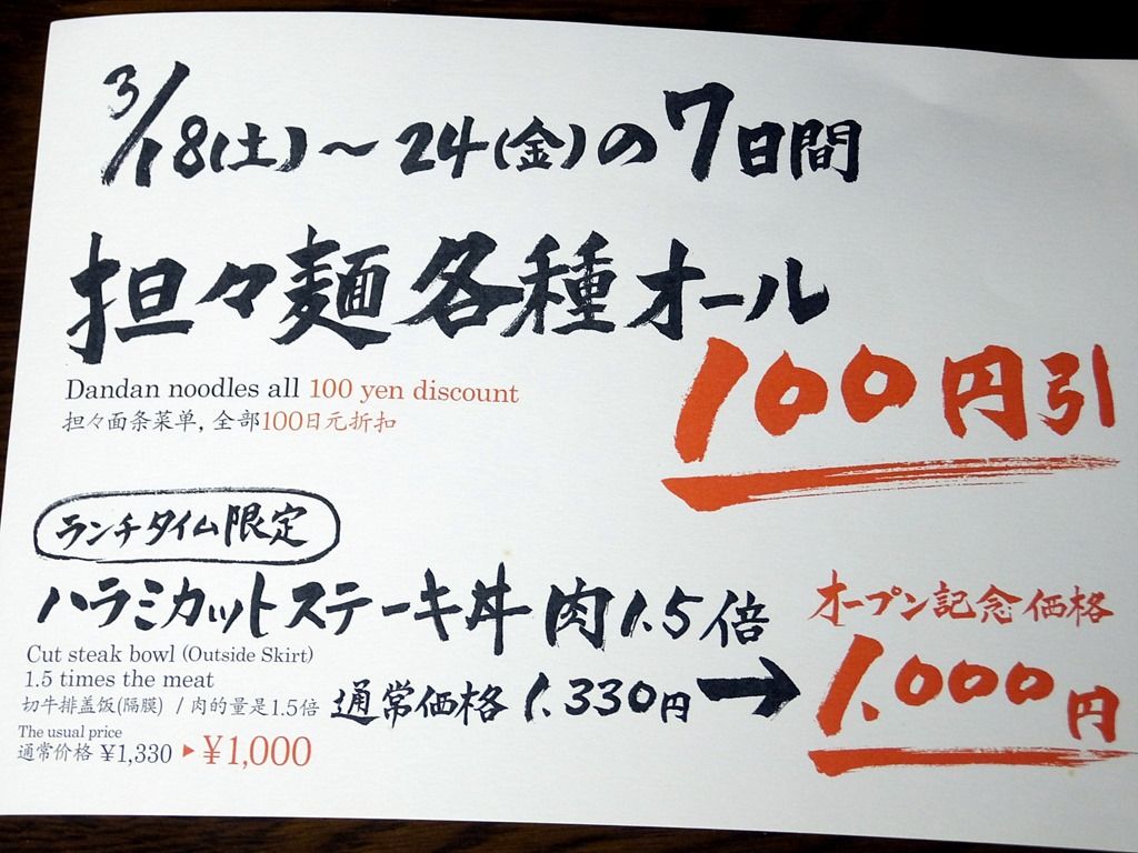 オープン記念セールとして、前述の通り3/18~24の7日間担々麺各種100円引き。加えて、ランチタイム限定でハラミカットステーキ丼肉1.5倍1330円が1000円。