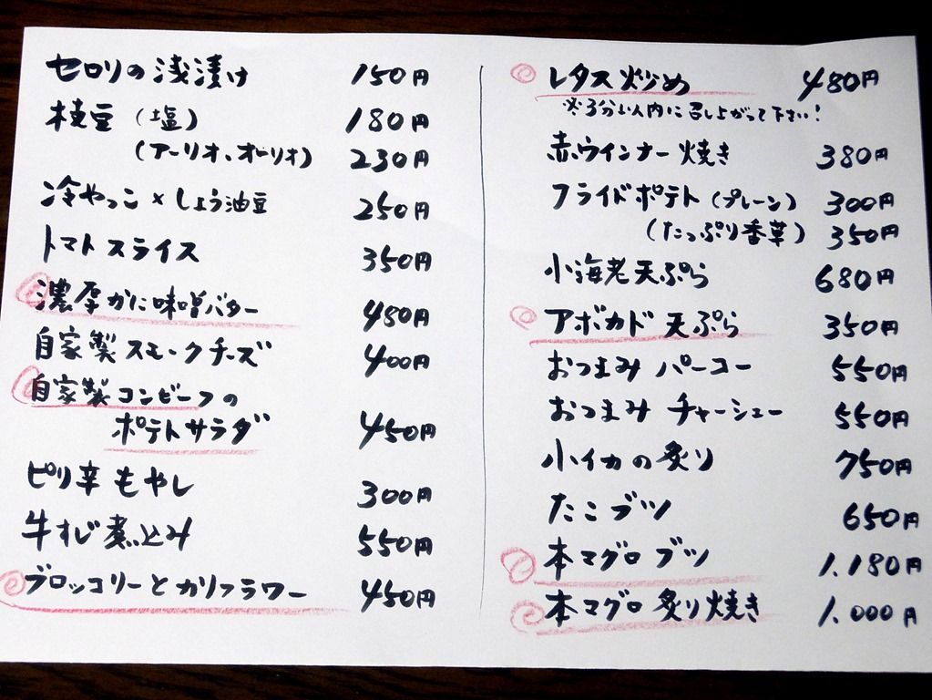 順番が来て着席。店内は、壁に向かったカウンター4席、4人卓・2人卓合わせてテーブル席が16席の計20席。ですが、この日はフロア中央の1卓2席を給水コーナ・荷物置き場にして、18席での営業。
