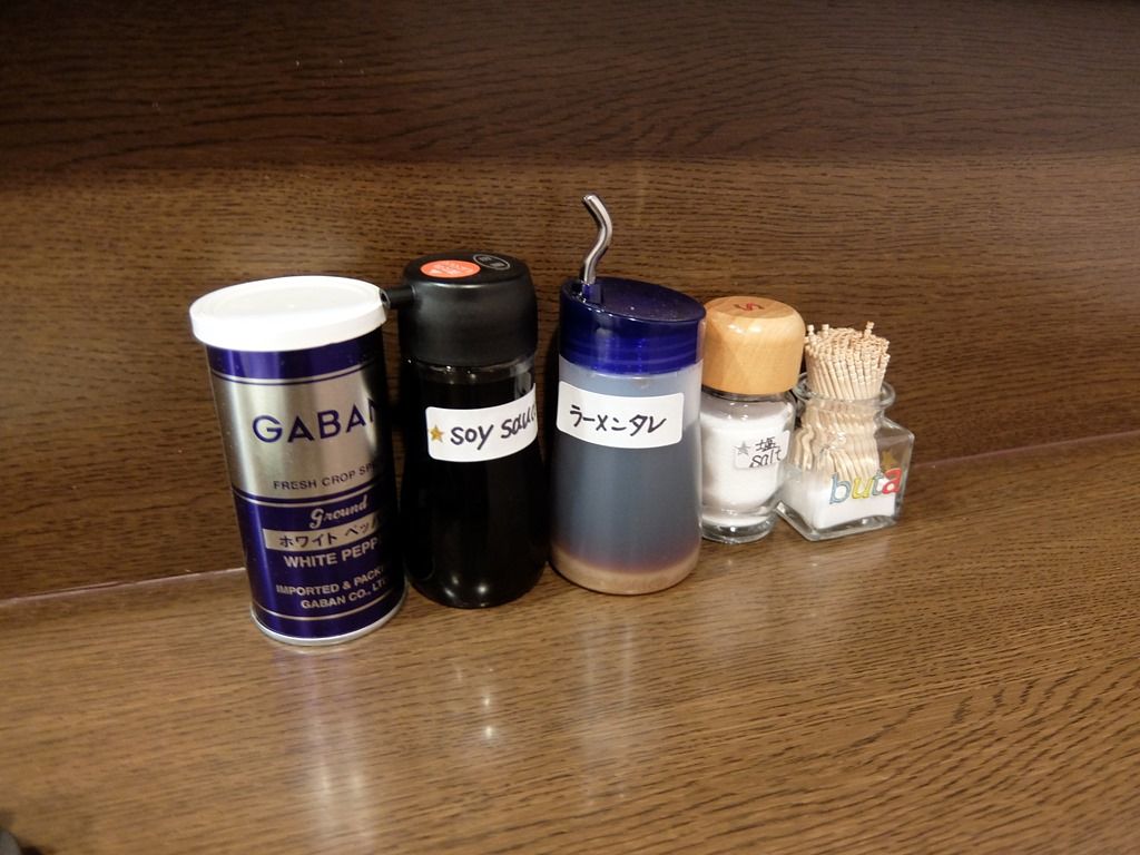 BGMはテレビ放送。箸は割り箸。卓上調味料は、GABANホワイトペッパー、醤油、ラーメンタレ、塩。