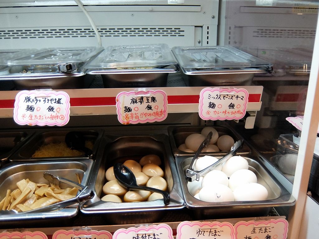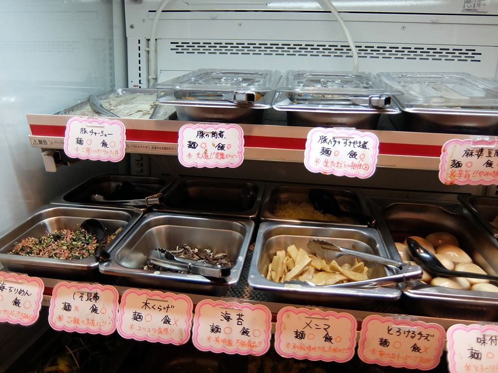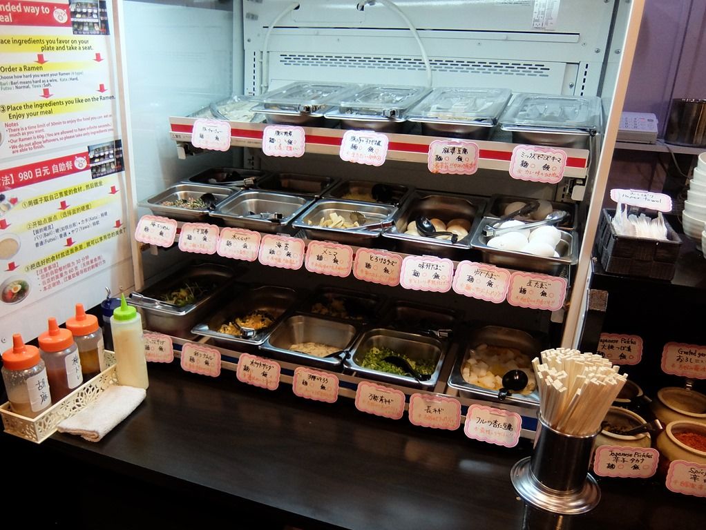 入店すると、出入口そばにブュッフェコーナーがあって、まず自由に好きなだけトッピングを取る様に案内があります。