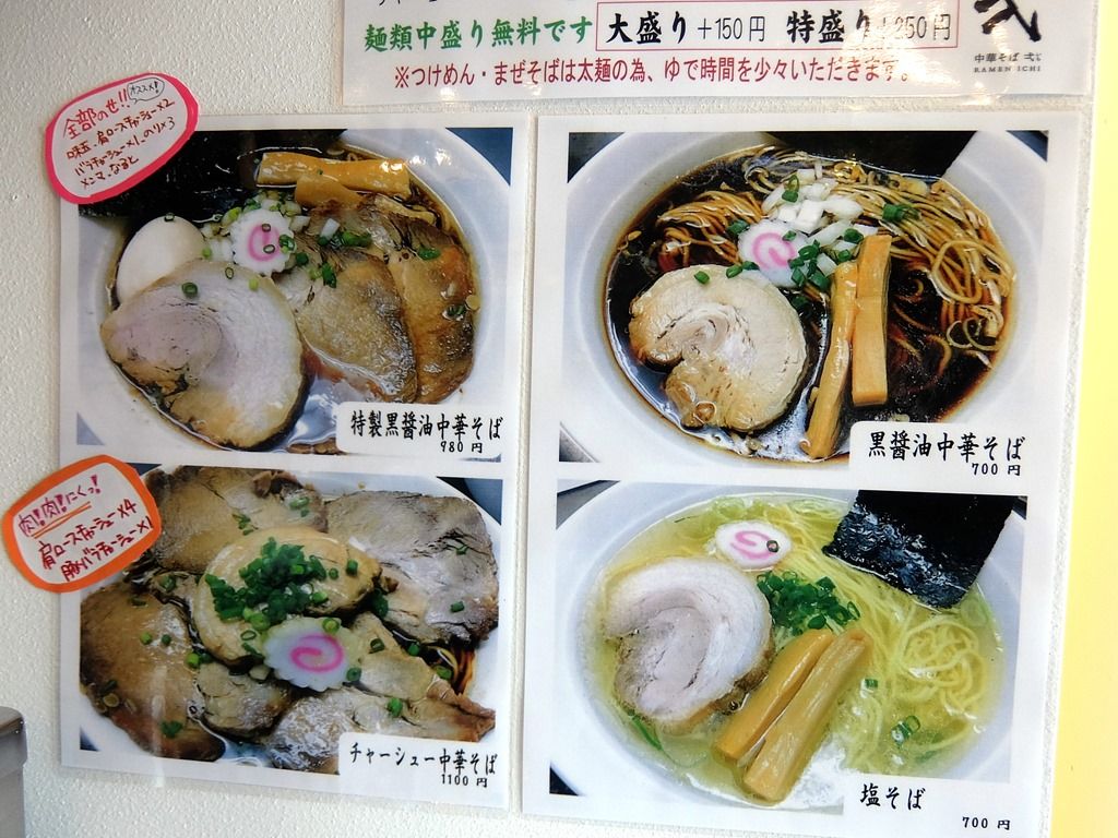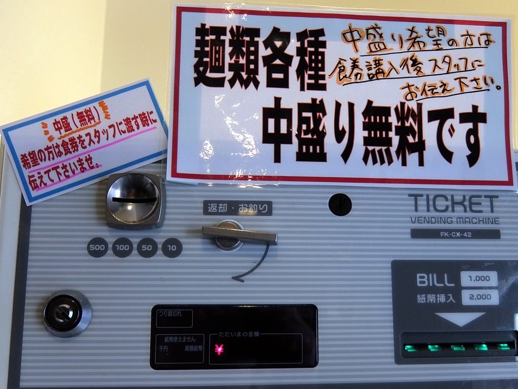麺類各種中盛無料。ですが特に聞かれないので、食券を渡すときに自己申告制。