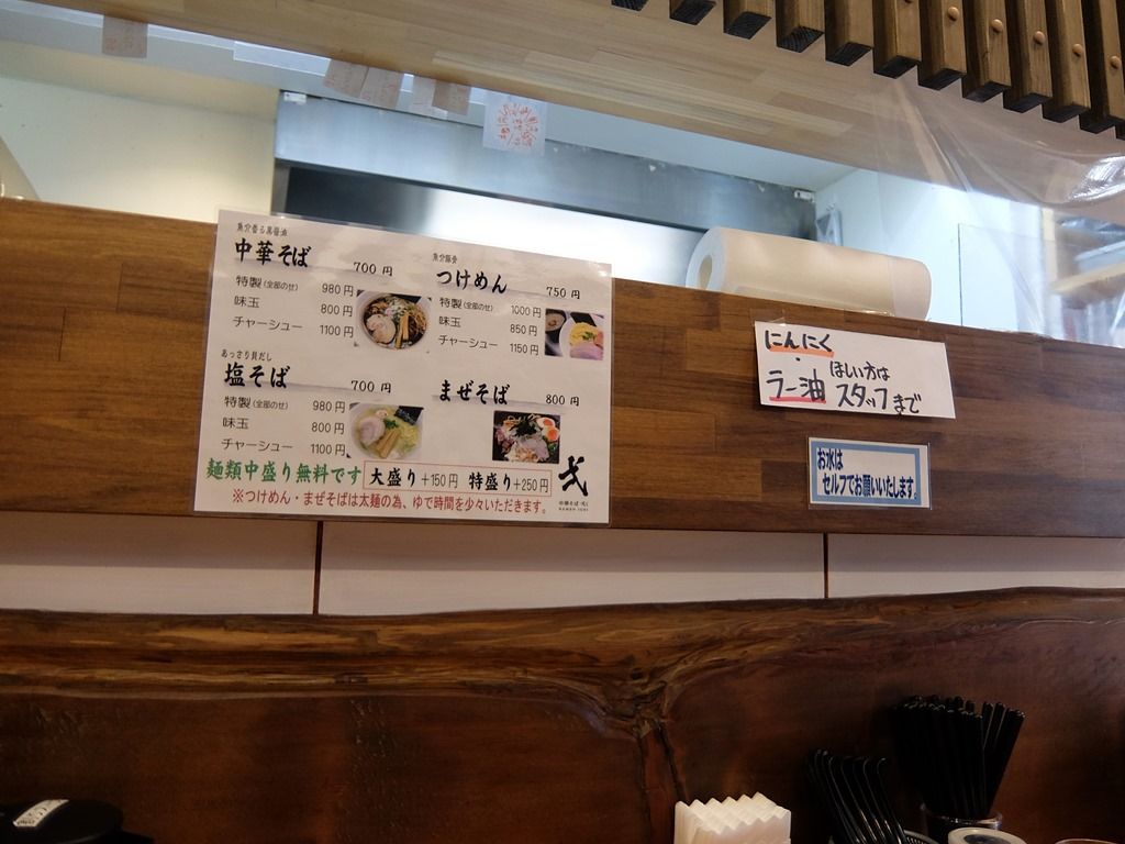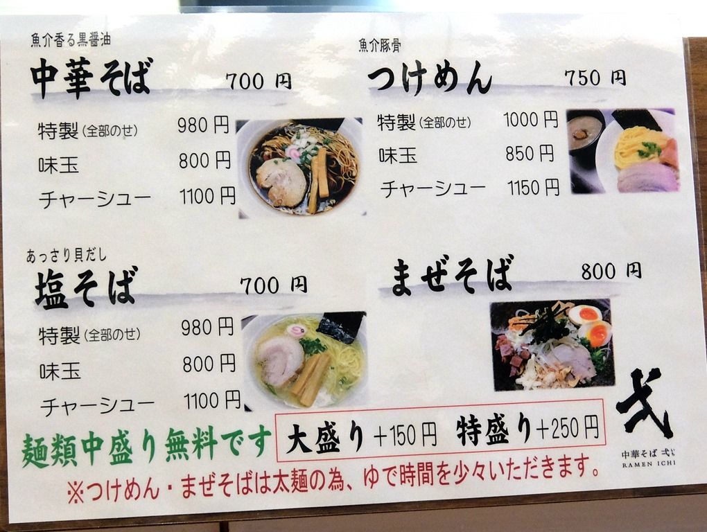 主なメニューは、魚介香る黒醤油 中華そば700円、あっさり貝だし 塩そば700円、魚介豚骨つけめん750円、まぜそば800円、他。