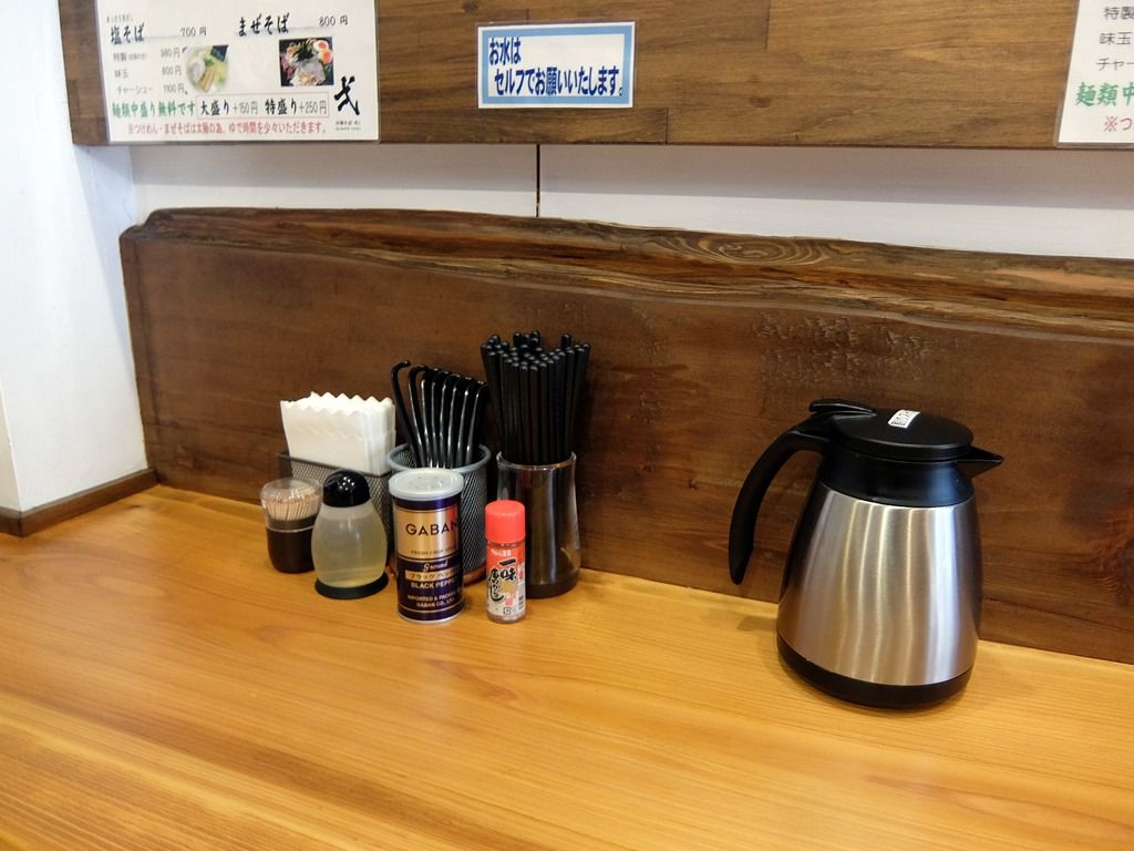 箸は洗い箸でエコ仕様。卓上調味料は、酢、GABANブラックペッパー、S&B一味唐辛子。にんにく・ラー油は言って出して貰うスタイル。