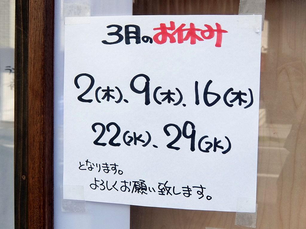 店頭には3月のお休み情報掲示。上旬木曜、下旬水曜休みと変則休。