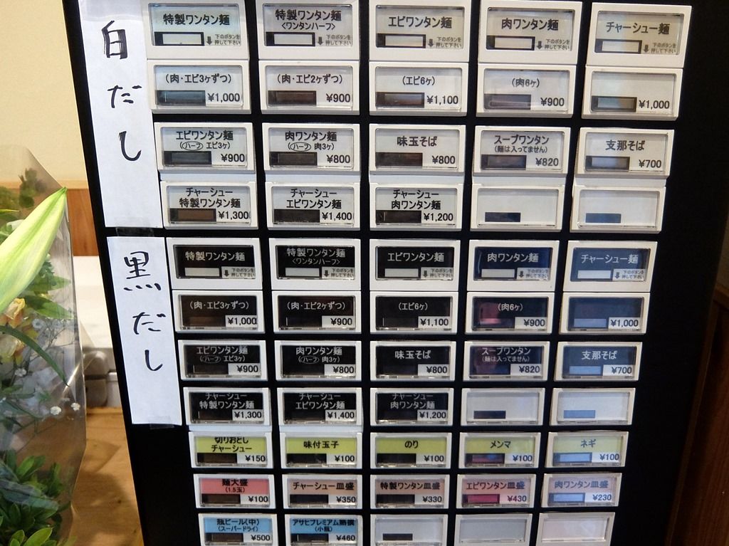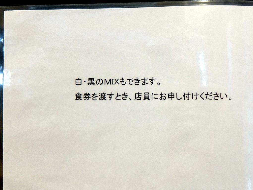 券売機ボタンで白だし・黒だしを選ぶ方式で、ミックスは食券を渡して伝えます。つけそばが無い他は、メニュー構成・値段まで八雲と一緒。八雲では移転前後共に白をキメていたので、今回はミックスと決めてました。