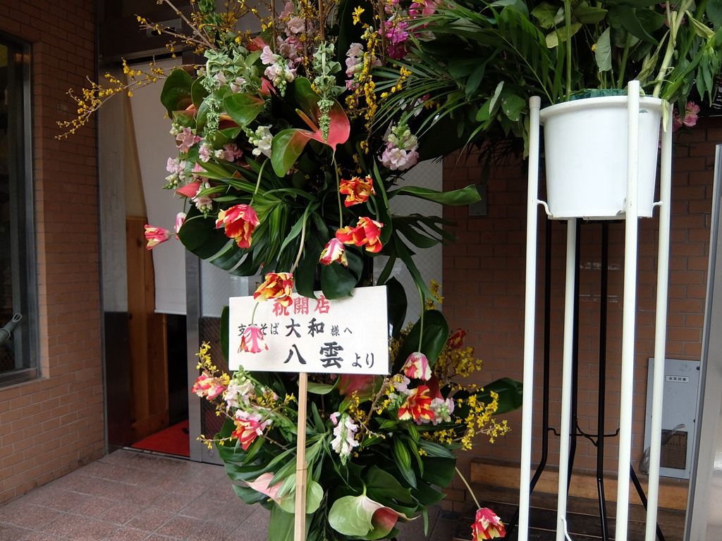 店の場所は、稲荷町駅3番出口徒歩約1分。上野駅浅草口からも徒歩約10分ほど。浅草通り沿い。「浅草魚市なかや」の跡地。店頭開店祝い花の中には修行先八雲からの花も。