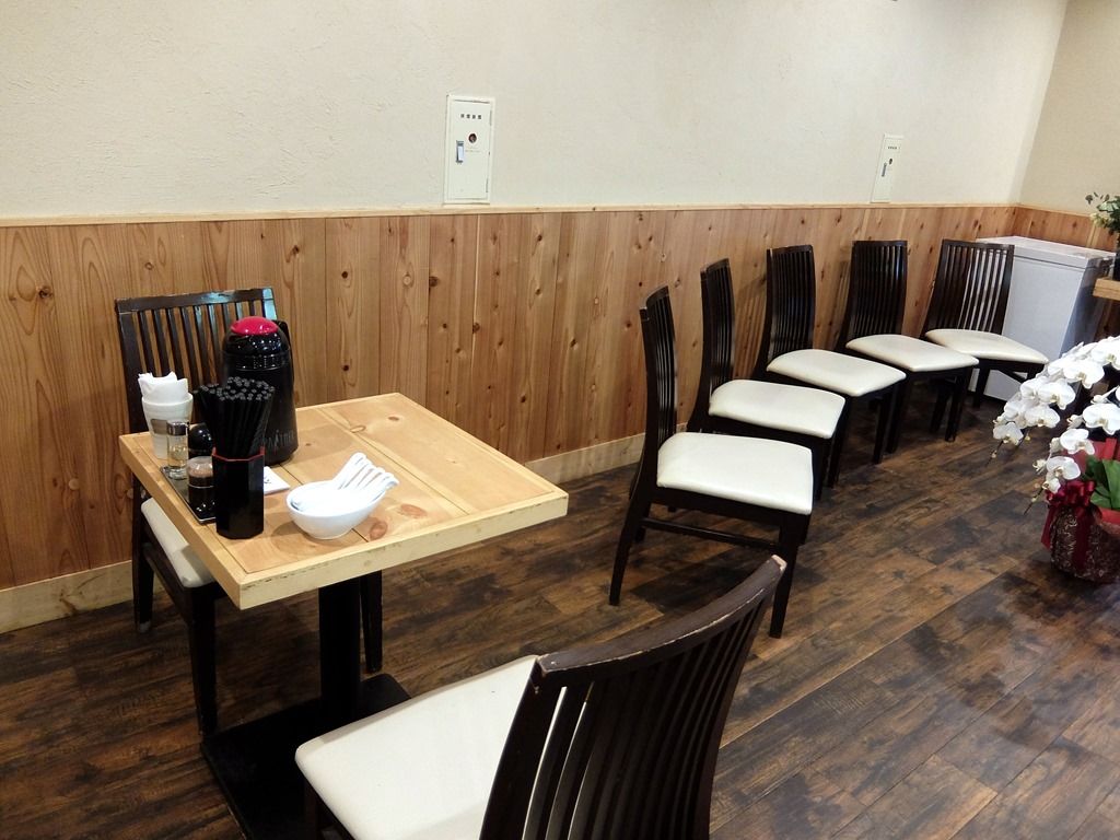 スタッフは厨房に男性3名、ホール担当男女各1名。BGMはポップス。箸は洗い箸でエコ仕様。卓上調味料は、一味唐辛子、胡椒、醤油、酢。醤油・酢は皿ワンタン用かな!?