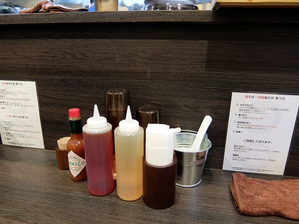 カウンターには、油そば・南極油そば、台湾まぜそば・汁なし担々そばの美味しい食べ方。料理の撮影OK、ただし他の客やスタッフの撮影禁止の記載あり。「台湾まぜそば」にタバスコを加えるとまろやかになるという新しい提案!
