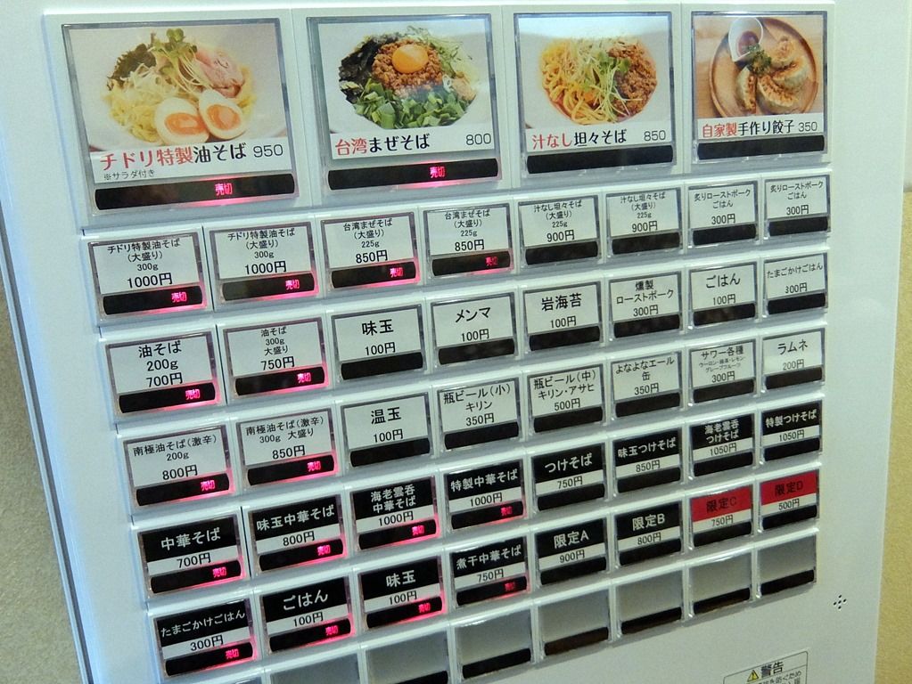 ゆっくり列が進んで店内へ。入店するとまず券売機で食券購入です。主なメニューは、チドリ特製油そば950円、台湾まぜそば800円、汁なし担々そば800円、油そば700円、南極油そば(激辛)800円、自家製手作り餃子350円、大盛り50円増し、炙りローストポークごはん300円、たまごかけごはん300円、他。油そば・台湾まぜそば・汁なし坦々と、人気の汁なし3種をフルラインナップ。「南極」は「北極ラーメン」のパロディ!?(^_^;)