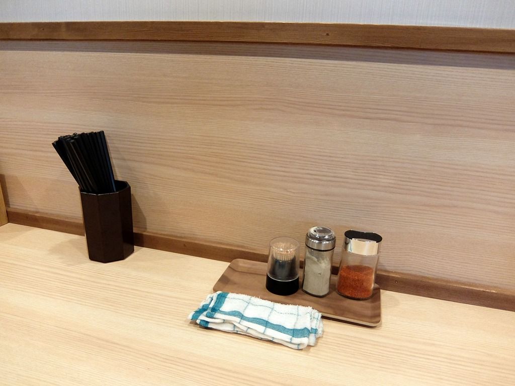 BGMは軽音楽。箸は洗い箸でエコ仕様。卓上調味料は、一味唐辛子、胡椒。