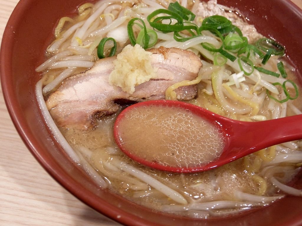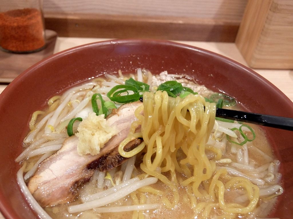 スープは熱々の清湯味噌味。中華鍋で味噌だれとモヤシを炒めて焼きを入れ、スープを加えて仕上げた一杯は抜群の香ばしさを発揮。純すみ系よりはショッパさが抑えられていて、まさにちょうどいい塩梅。生姜が素晴らしく良く合います。一味をちょっと少々加えての辛味噌への味変も最高!すごく美味しい!