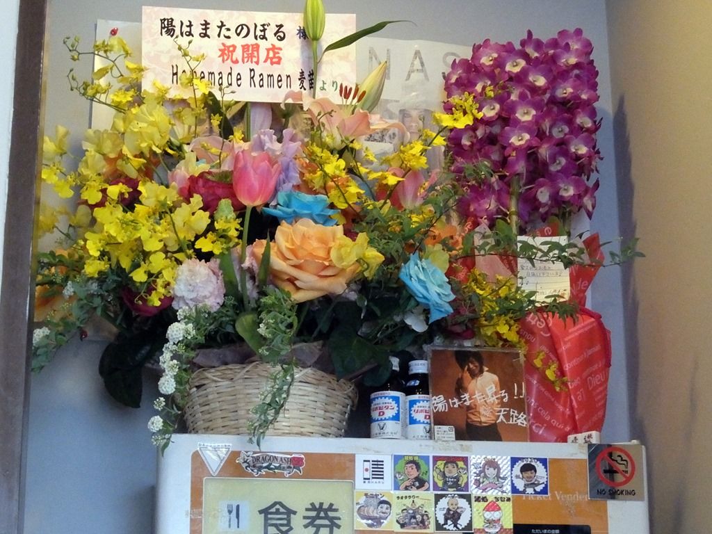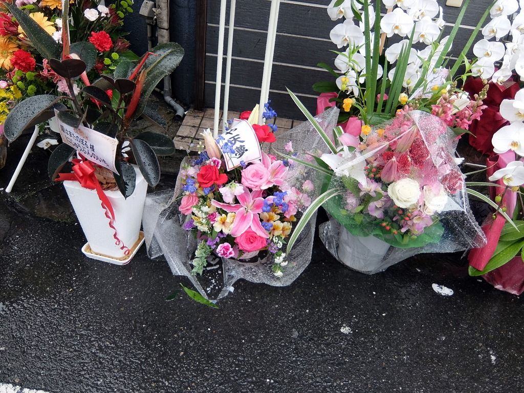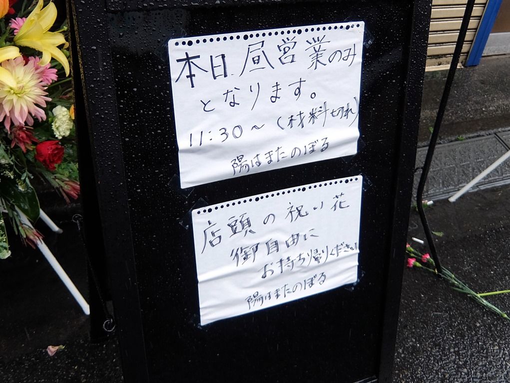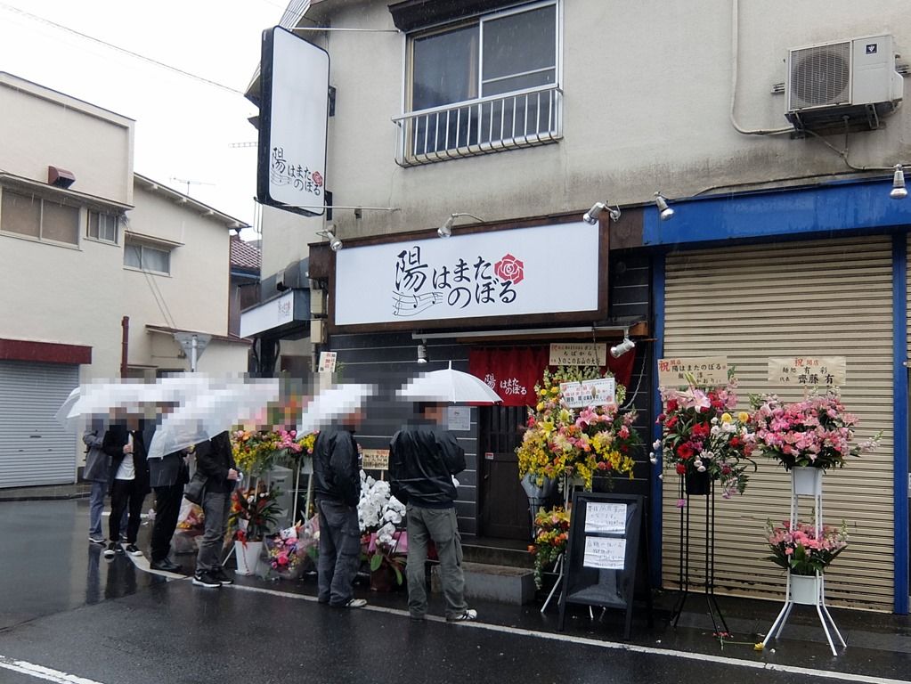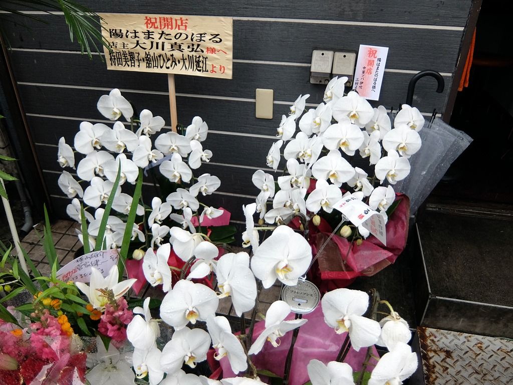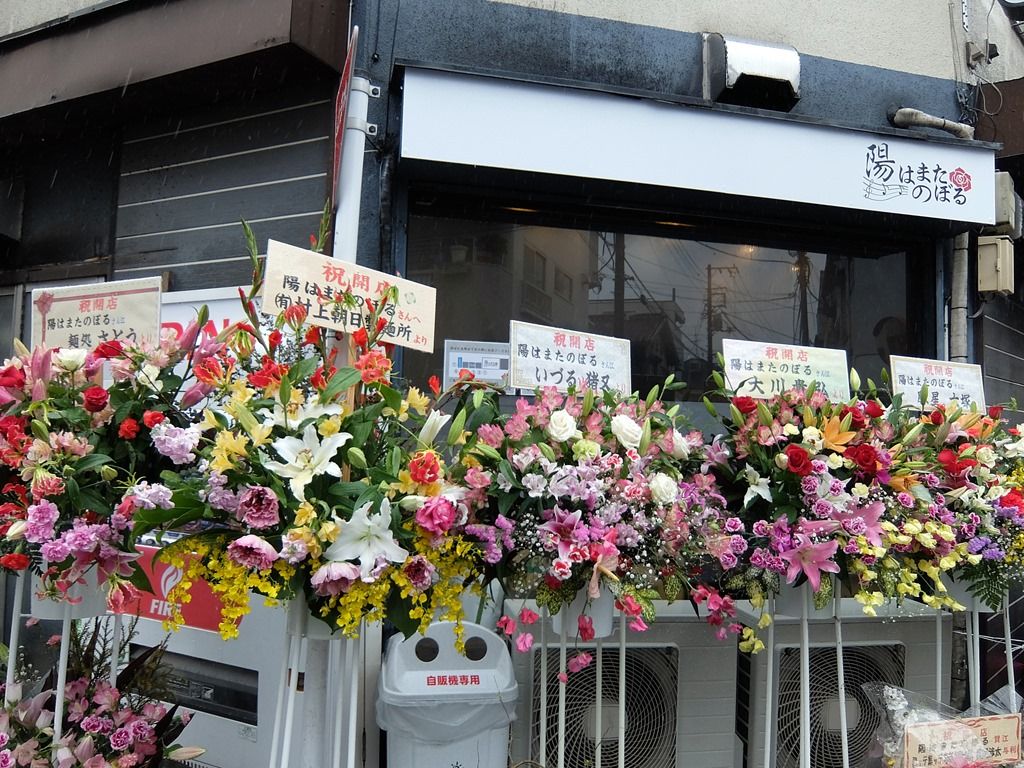 店舗をぐるりと取り囲むように開店祝花多数。気づいたところでは、豚星、麺処ゆうき、