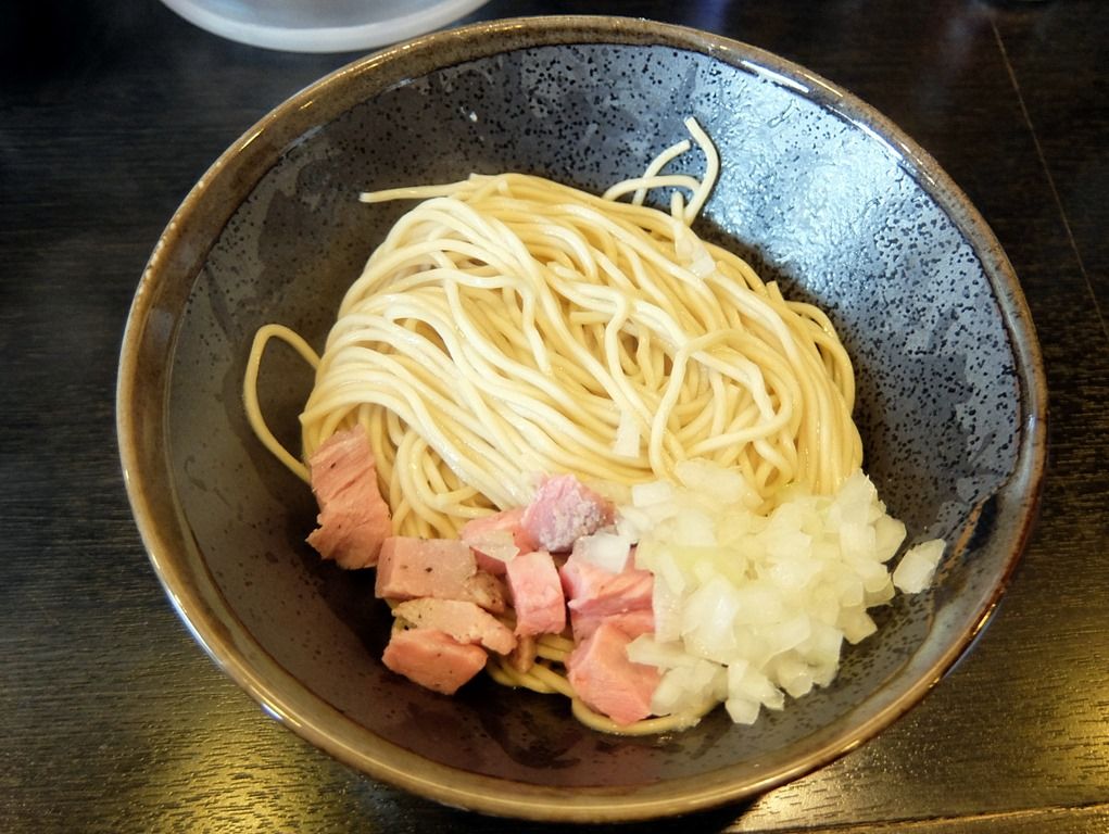 「和え玉」は味の付いた替玉ですが、細切れチャーシューと玉ねぎみじん切りがトッピング。麺は濃厚と和え玉で同じとか、淡麗系の麺は異なるようです。