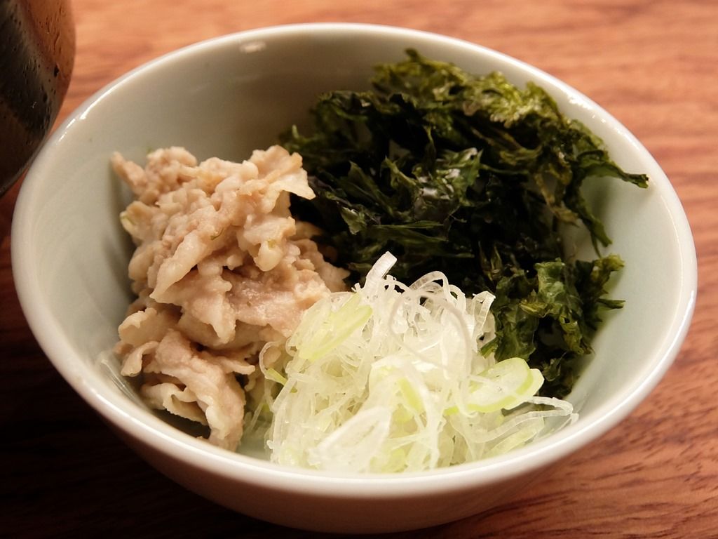 別添えの薬味・具は、ほぐし豚肉、あおさ海苔、きざみねぎ。