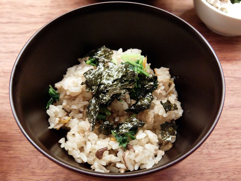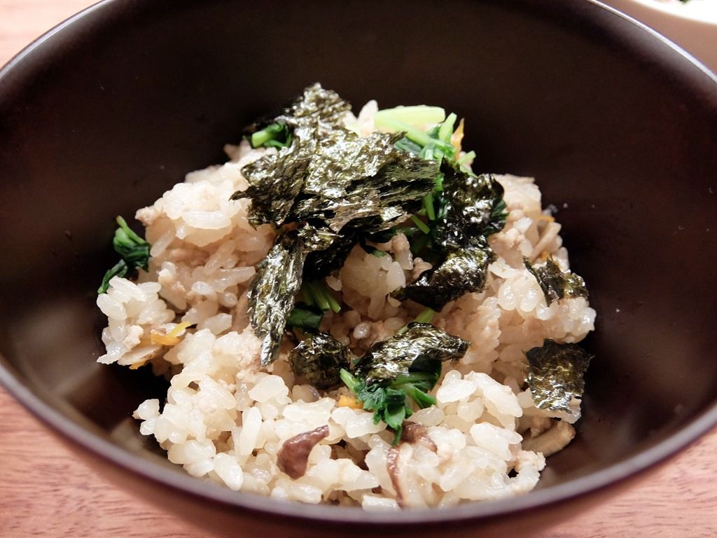 シンプルな炊き込みご飯で、具は、しいたけ、にんじん、鶏そぼろ、三つ葉、きざみ海苔、他。醤油味ベースで、ほのかに鴨の風味が薫ります。料亭の味、和食の技が活きた炊き込みご飯で、必食の旨さ!