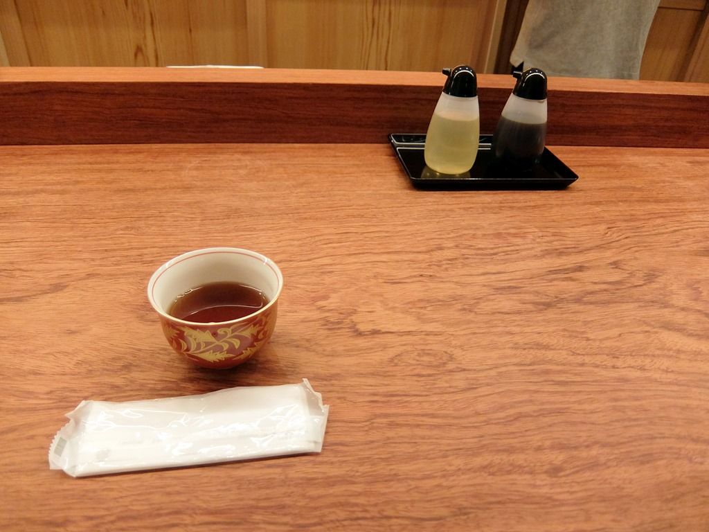 お冷代わりのウェルカムティーは、温かいほうじ茶。BGMは無し。卓上調味料は、胡麻油、醤油。