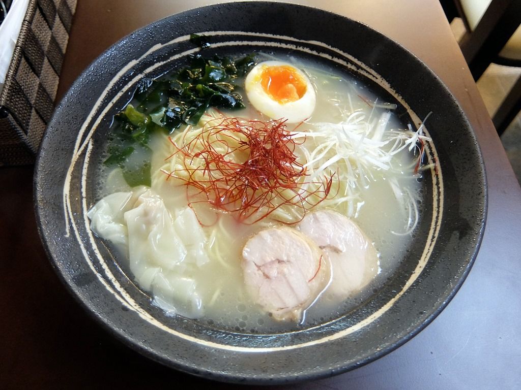 具は、鶏チャーシュー、ワンタン、味玉半個、ワカメ、糸唐辛子、白髪ネギ。