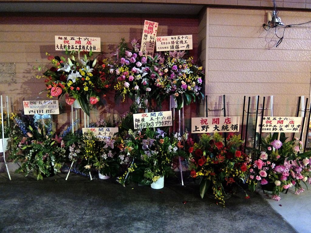 店頭には開店祝花多数。ラーメン店では麺バル3x3(サザン)から。店主さんの兄貴分という方が、「泣きながら修行して出したお店」とツイートしてたので、店主さんはもしかして3x3出身でしょうか!?