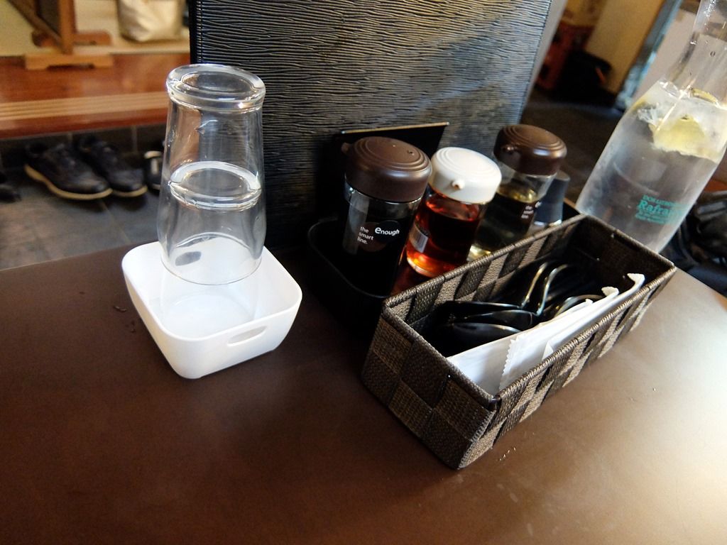 BGMは、麺バル3x3同様サザン縛り。箸は洗い箸でエコ仕様。卓上調味料は、醤油、酢、ラー油。