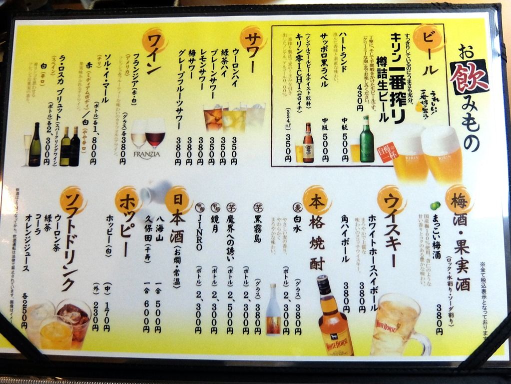 店内は、厨房前に真っ直ぐなカウンター5席、4人卓x1、2人卓x2。小上がりに4人卓x4。20:30頃到着で、先客15、後客無し。多くの方が開店祝いに駆けつけた友人・知人の皆様で、祝杯を挙げる酒宴状態^^;