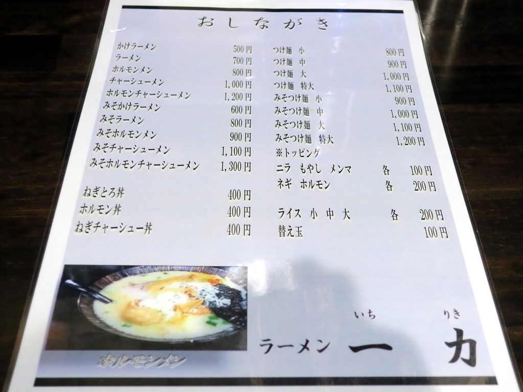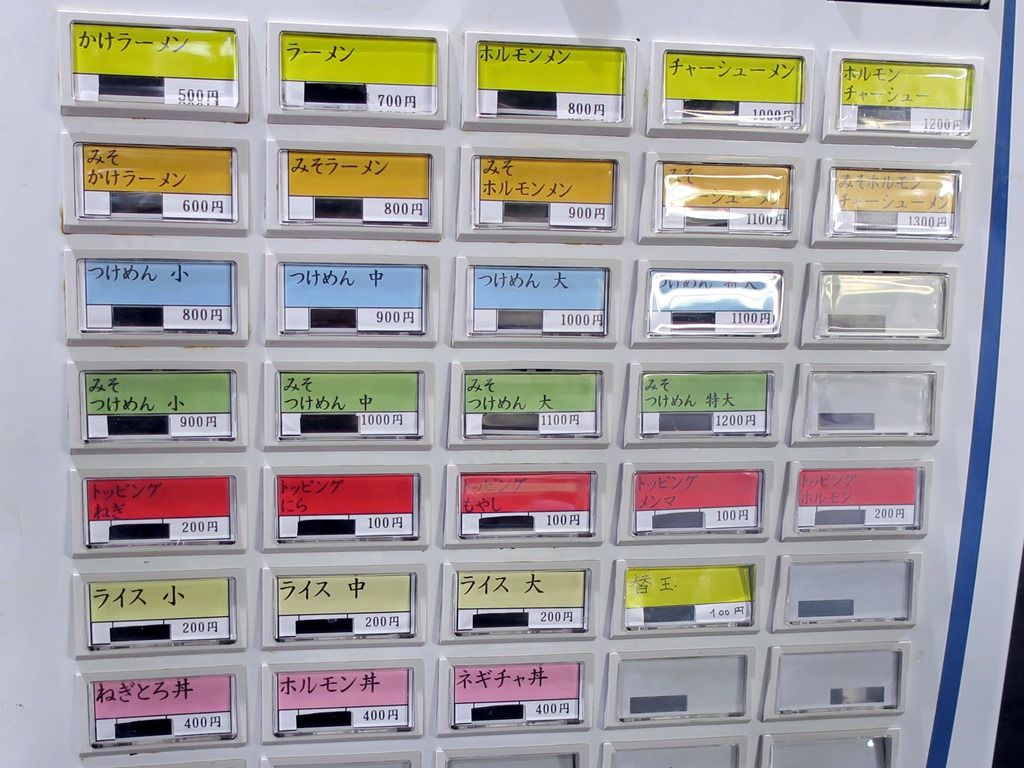 入店すると、まず券売機で食券購入です。が、この日は「券売機はまだ使えません」と声がかかって前金制。主なメニューは、ラーメン700円、ホルモンメン800円、みそラーメン80円、みそホルモンメン900円、つけ麺小800円、みそつけ麺小900円、他。オーダーは一番人気のみそホルモンメンで。