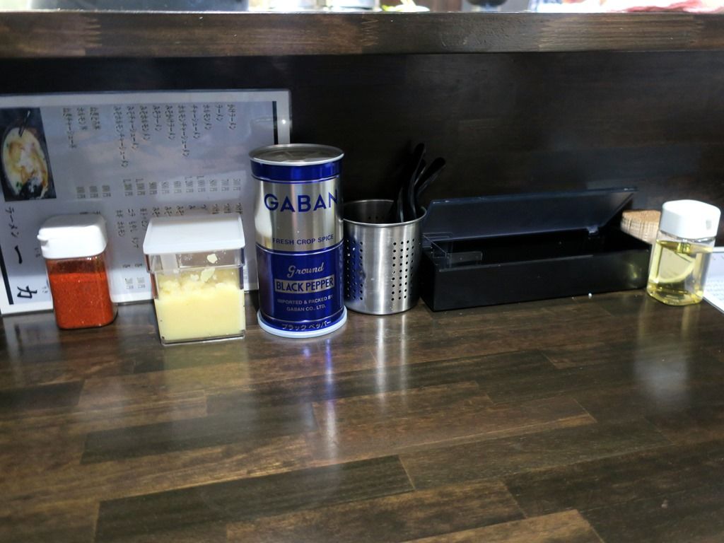 BGMはなし。箸は洗い箸でエコ仕様。卓上調味料は、おろしニンニク、一味唐辛子、GABANブラックペッパー、酢。