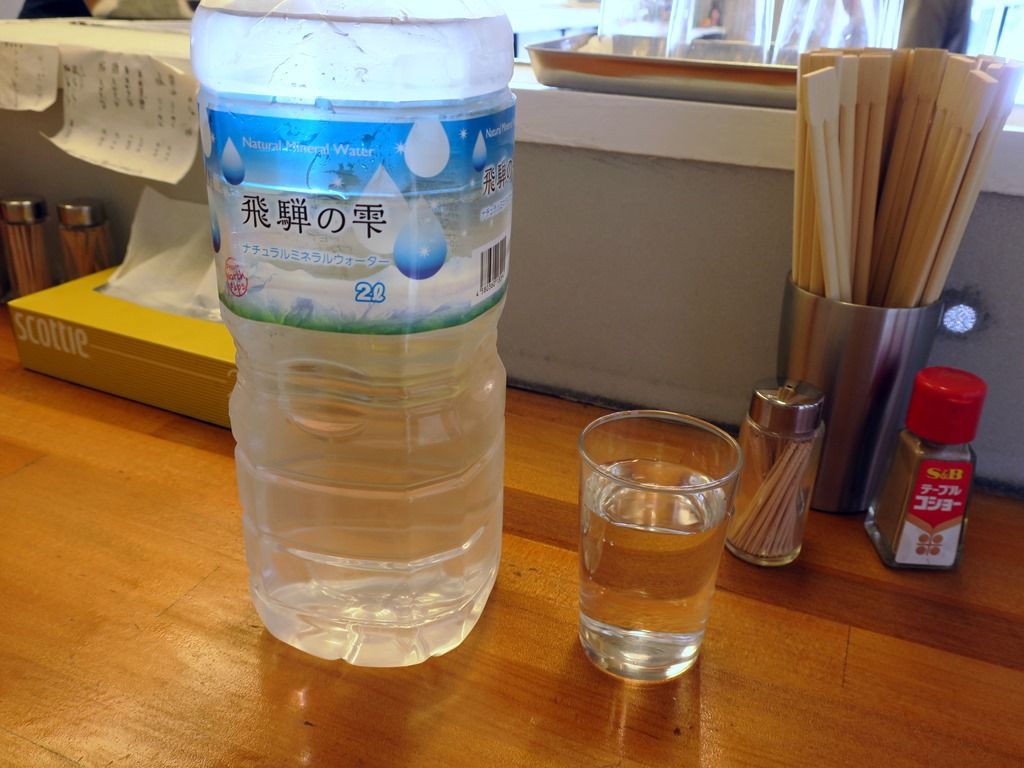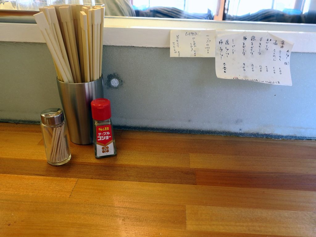 BGMは軽音楽。寡黙な店主さんで、店内はちょっと緊張感。箸は割り箸。卓上調味料は、S&Bテーブルコショー。