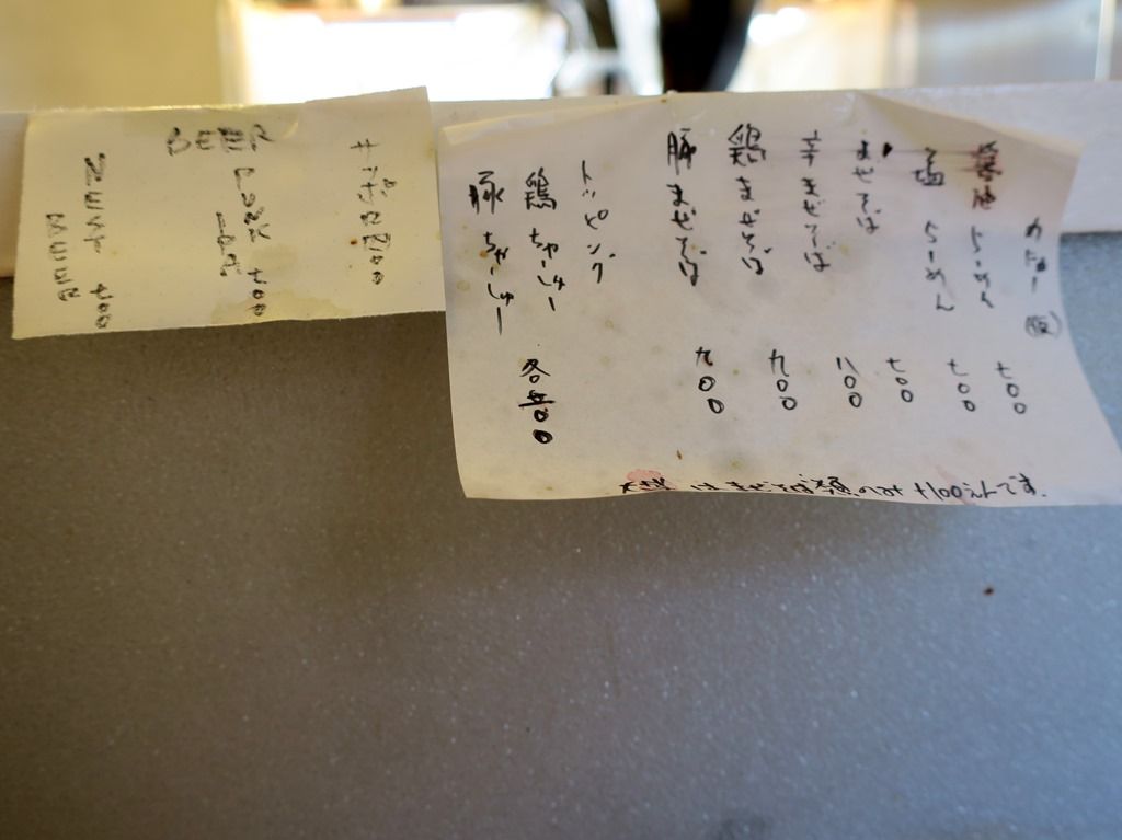 券売機はなく後会計制。主なメニューは、醤油らーめん700円、塩らーめん700円。まぜそば700円、辛まぜそば800円、鷄まぜそば900円、豚まぜそば900円、他。