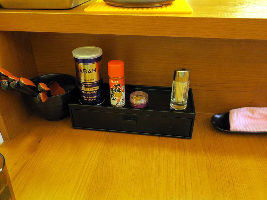BGMはももクロ縛り。川瀬店主は、モノノフでしたっけ? 箸は割り箸。卓上調味料は、GABANブラックペッパー、S&B一味唐辛子。