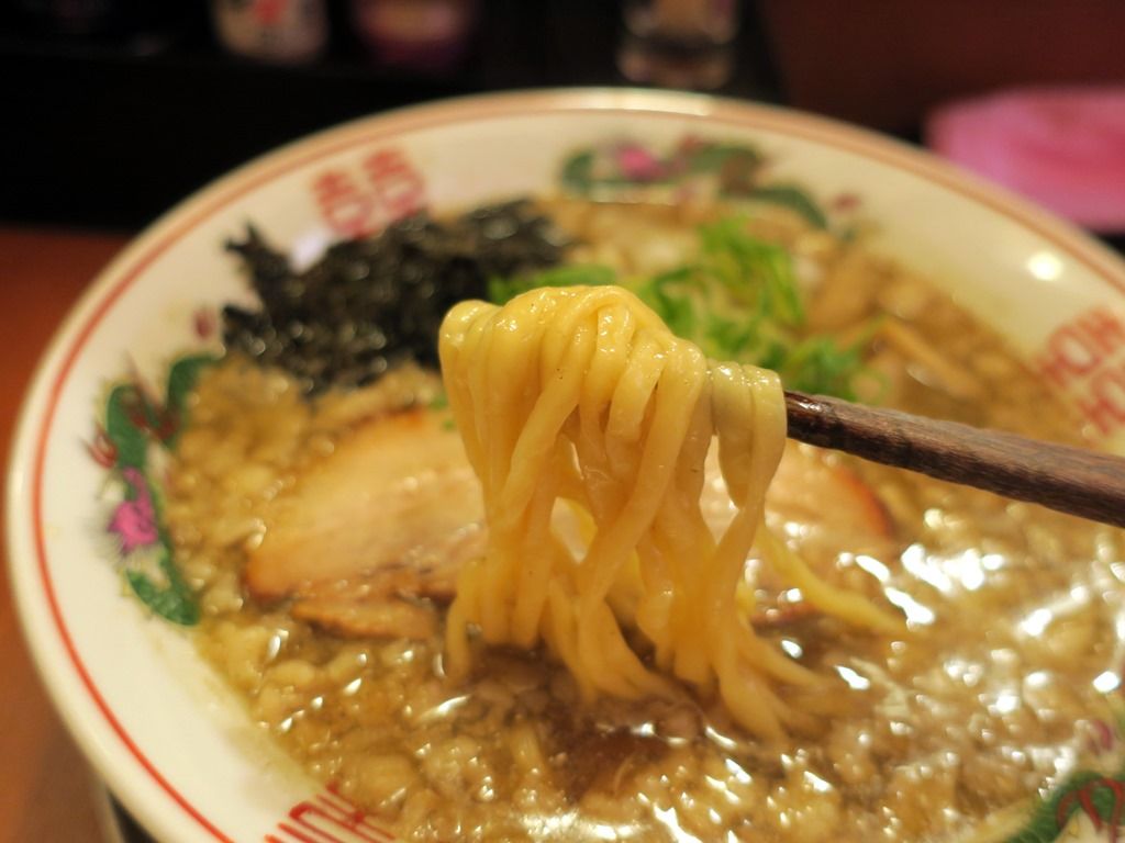 麺はストレート中太タイプ。モッチモチの麺が背脂煮干スープをまとって桃源郷の境地に。ハマること請け合いの旨さです!