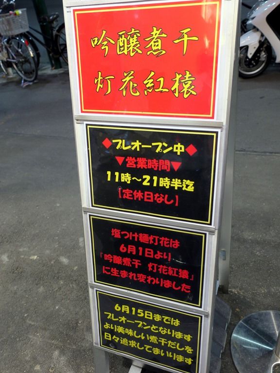 灯花ヒストリーw 2012年6月30日「塩つけ麺 灯花」オープン。場所はもぐら→なおじと入れ替わった約3坪の激狭店。2015年4月27日、2号店の「鯛塩そば 灯花」オープン。2016年11月17日、3号店の「京紫灯花繚乱」オープン。2017年6月1日、1号店が「吟醸煮干 灯花紅猿」としてリニューアルオープン。