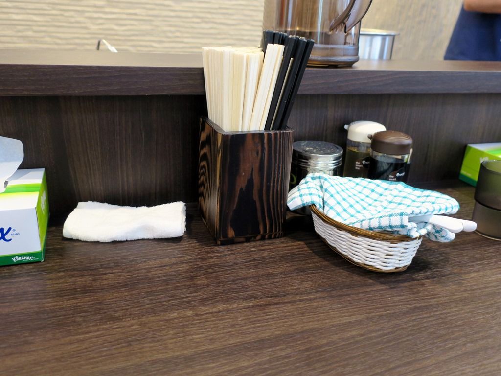 BGMはテレビで、メレンゲの気持ちなうオンエア。箸は洗い箸と割り箸のW装備。卓上調味料は、醤油、胡椒、酢に見える透明な瓶は、替玉でスープが薄くなった時に使用する塩だれ。何か貼っといた方がいいかも^^;なお、TKG頼むと、別にTKG専用の醤油が出てた様な。